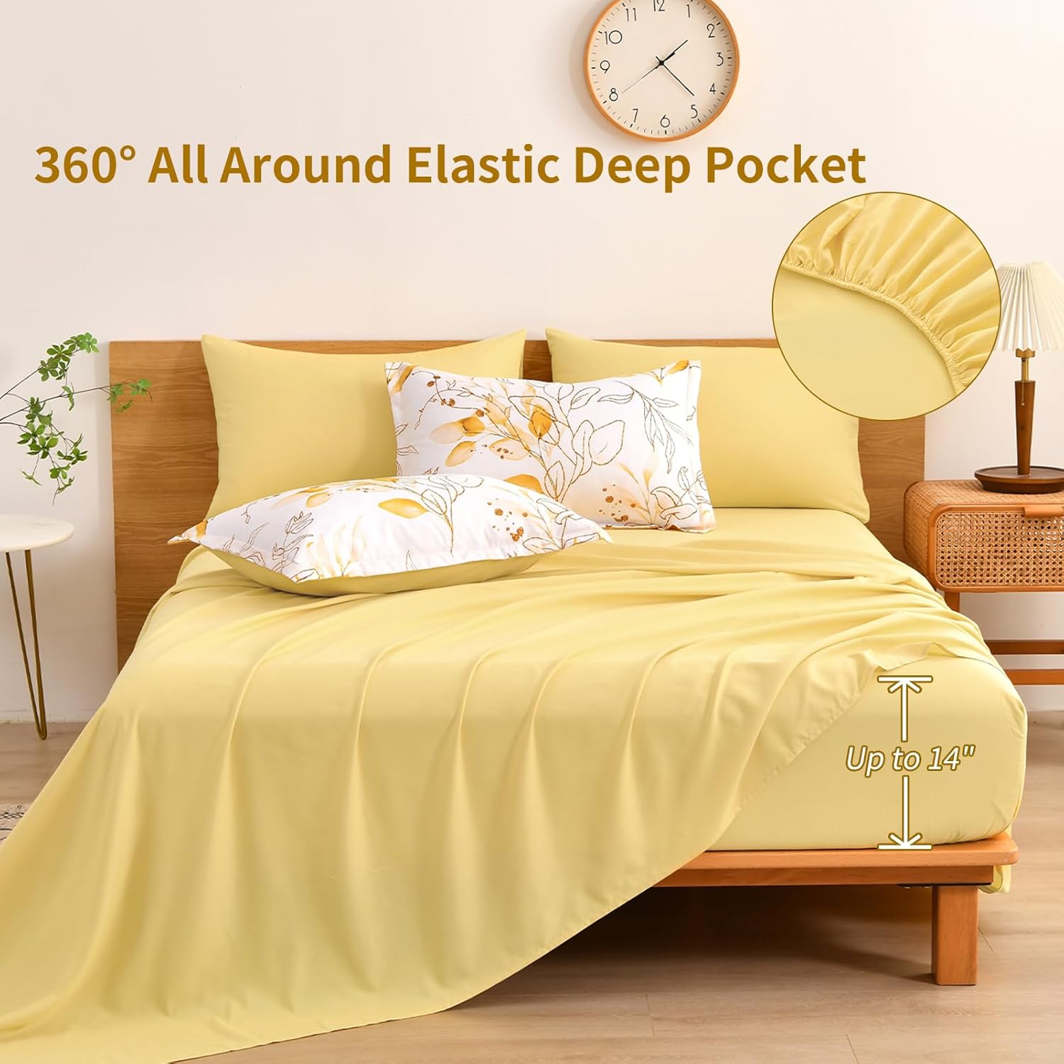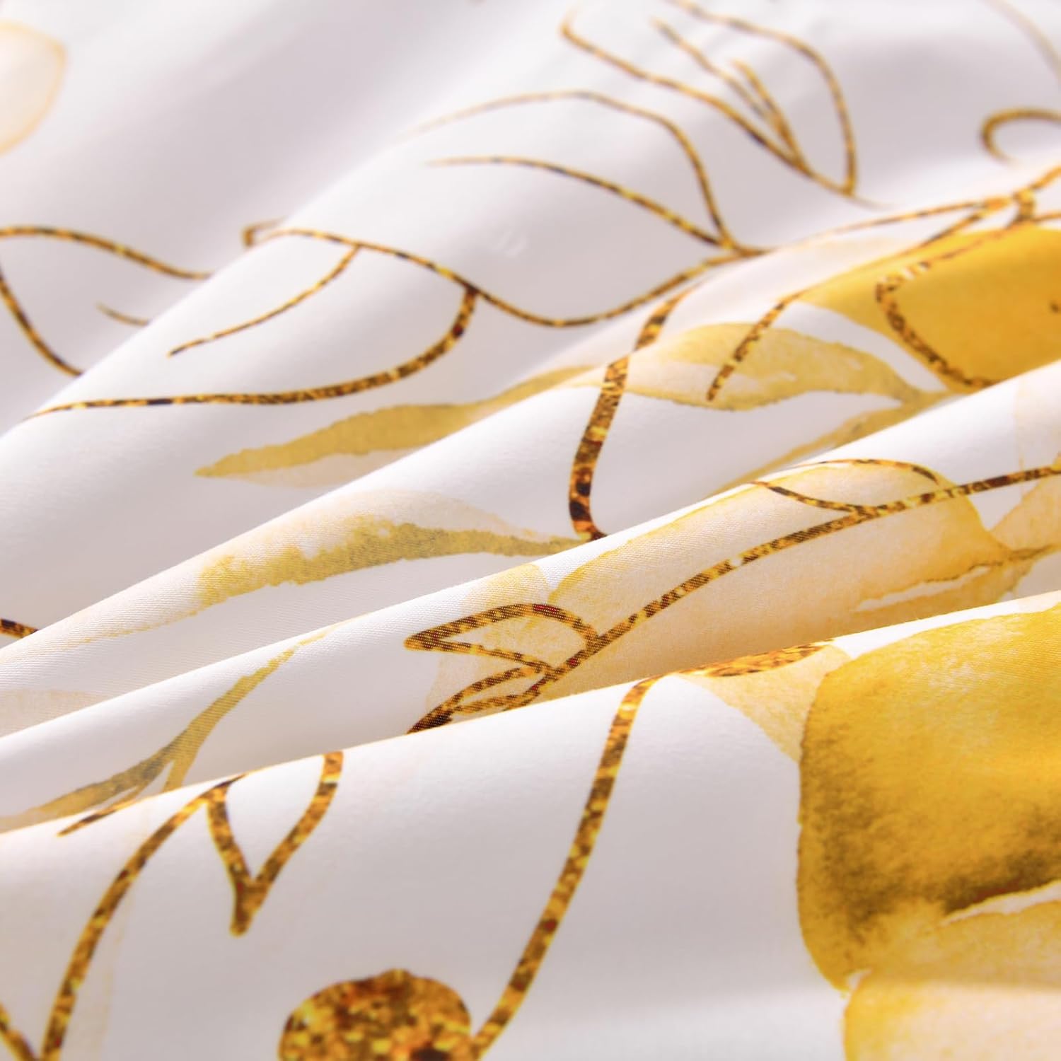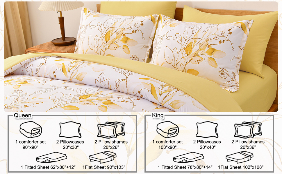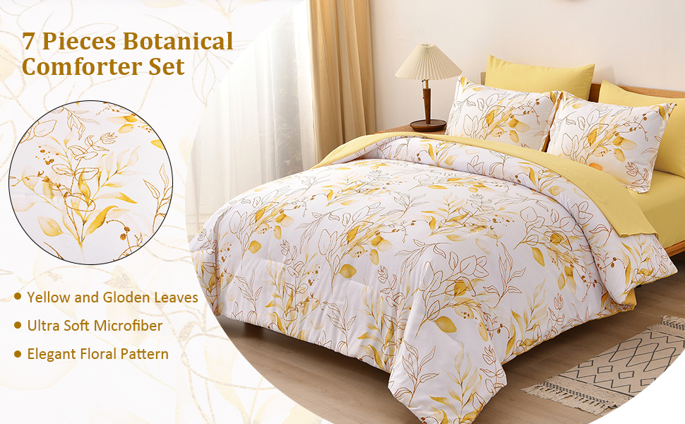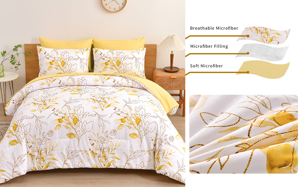 [BOTANOCAL REVERSIBLE PATTERN]:This comforter set queen adopts a reversible design.A side is yellow and gold leaf looking beautiful color give your bedroom a bright and lively atmosphere, suitable for people of all ages. B side is a fresh soft yellow. Soft color combinations to make your bed look more luxurious.