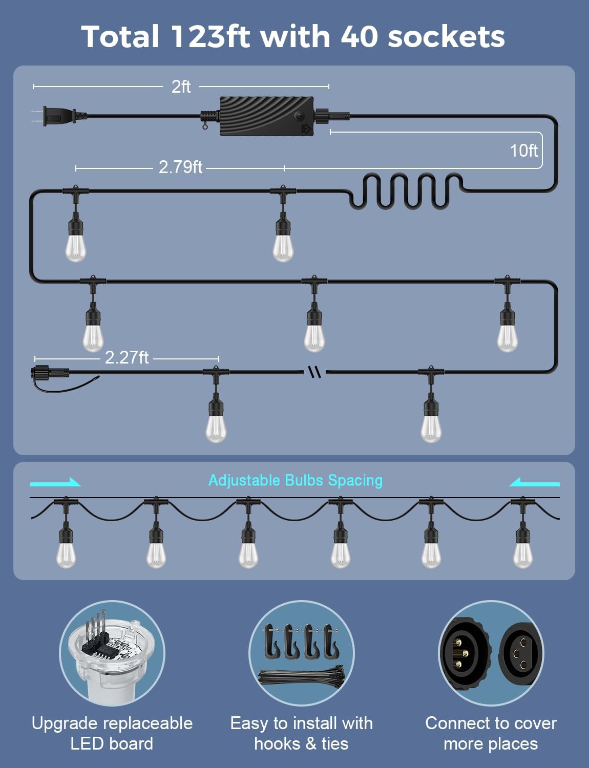 Shatterproof and IP65 Waterproof: LED bulbs are made from durable plastic, resistant to accidental drops and bumps. This outdoor string lights waterproof ensures both lights and adapter fit for outdoor use, and last with a 30,000-hour lifespan