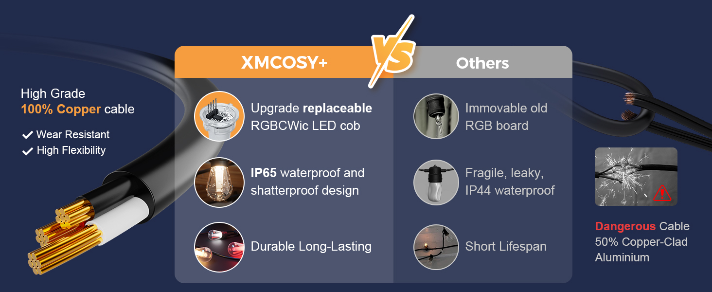 Smart App & Voice Control: Use your LED string lights effortlessly with XMcosy App. Pair with Alexa & Google Home, or set an auto light task. Control with one tap or one command, offering more convenience and flexibility in managing outdoor lighting.