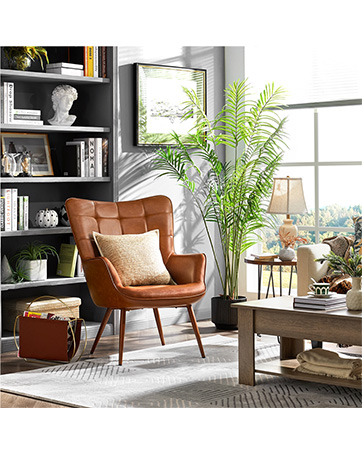 Mid-century Modern Style: This armchair features a low-profile seat, splayed legs and brown faux leather for a stylish mid-century modern look. The slightly curved armrest contrasts with the straight silhouette of the seat, which will easily match a variety of home styles