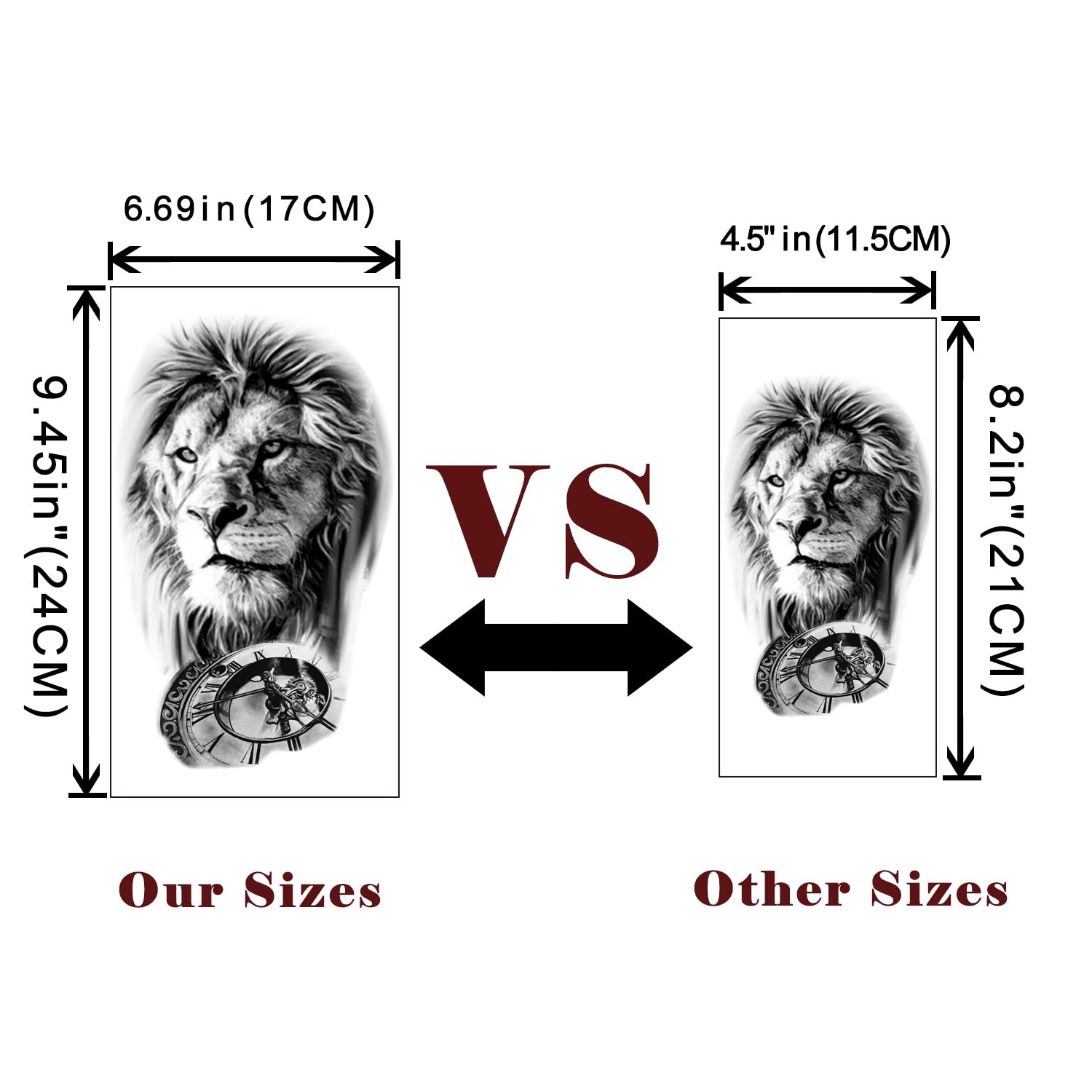 [Large Size & Large Quantity Temporary Tattoos] Large size half arm tattoo stickers can cover your body parts larger, size is 9.45 * 6.69 inch (24 * 17cm) 12 sheets, 4.1 * 2.4 inch (10.5 * 6cm) 24 sheets .You can share these temp tattoos for adults with your family and friends. Suitable for parties, school, holidays, nightclubs, beaches, weddings, music festivals, costumes, Halloween and daily life. Mixed and match a great combination of tattoos such as 3D Half Sleeve Temporary Tattoos, Halloween Scary Lion Wolf Tiger Skull Skeleton Tattoos taht your friends will think it is real tattoos!