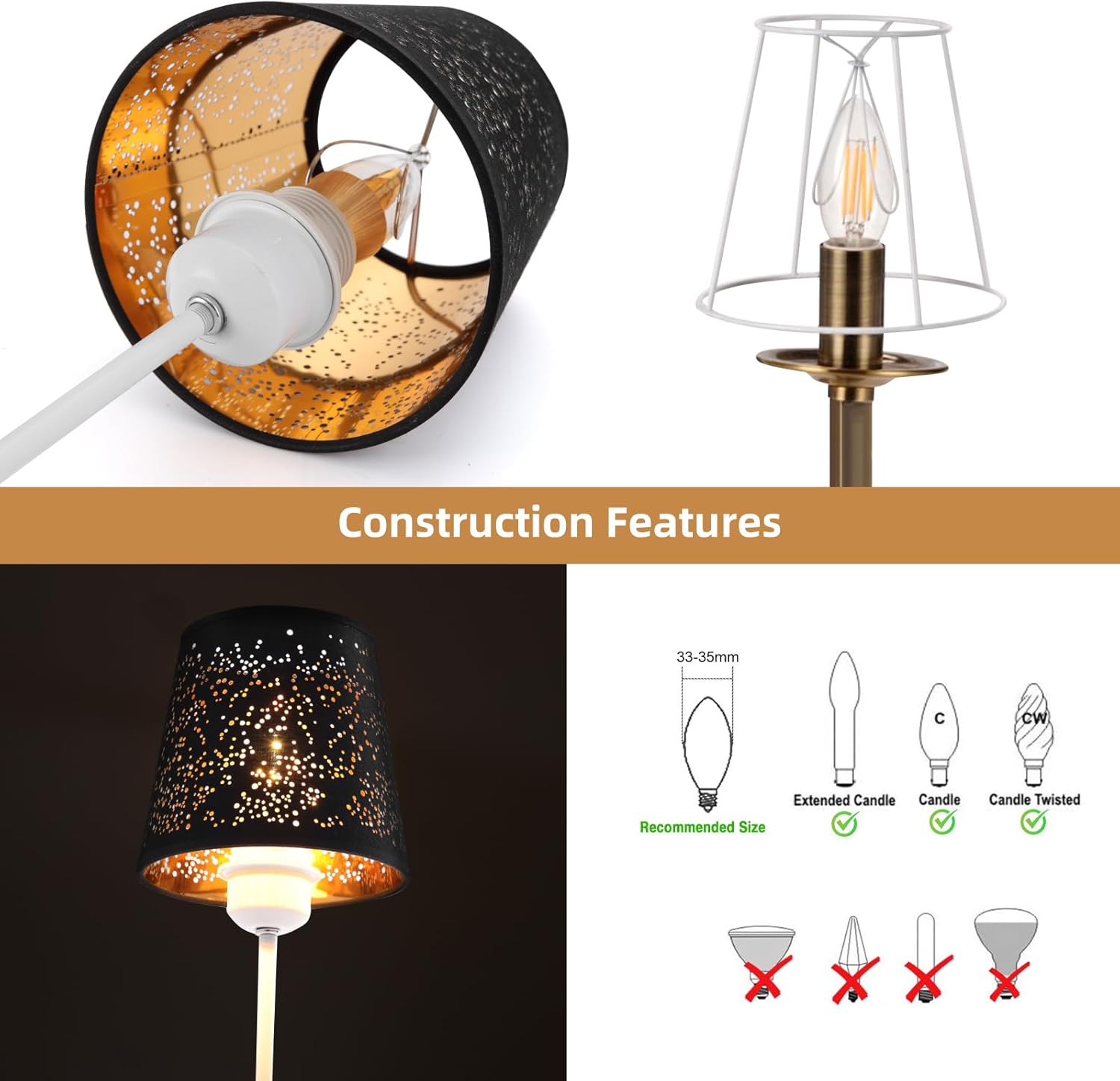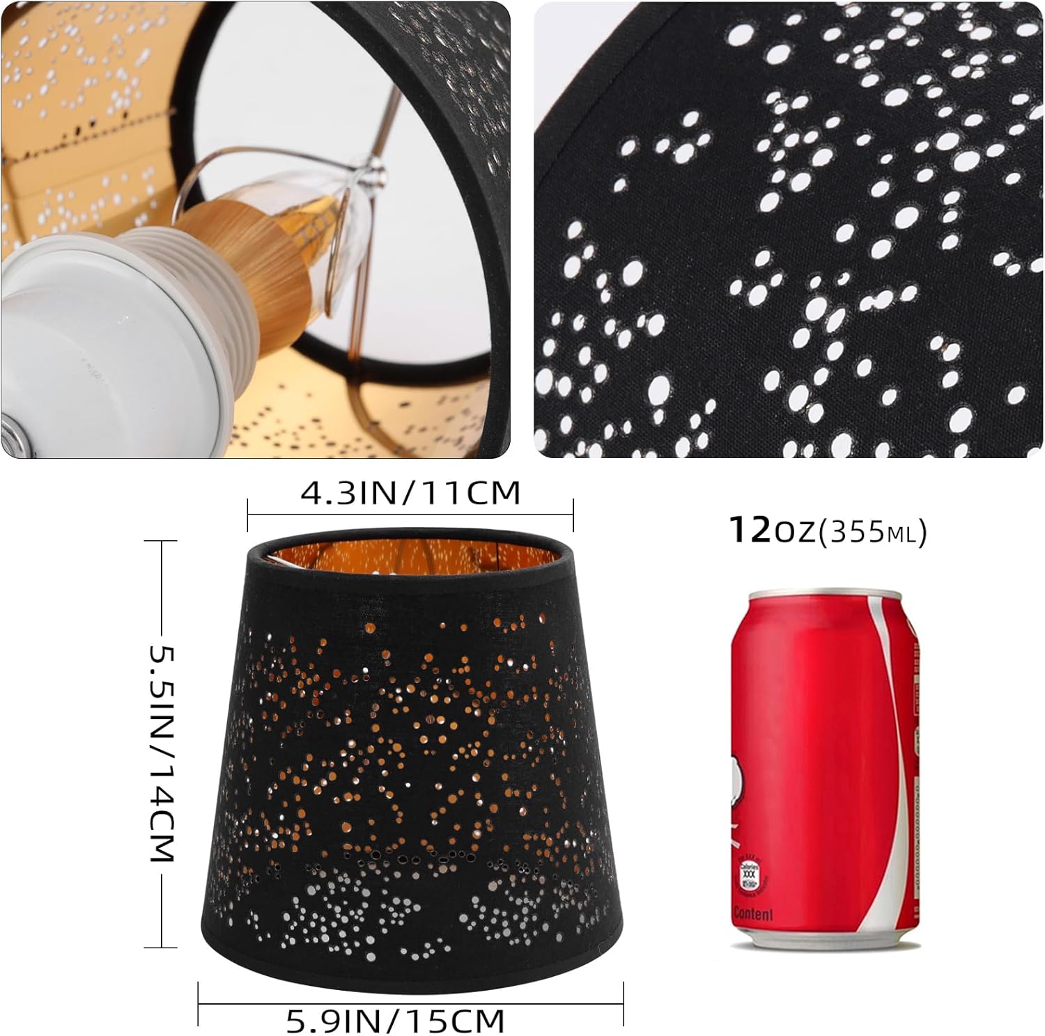 SIZE OF LAMP SHADE: 4.3×5.9×5.5 in (Top open diameter x bottom open diameter x height). Suitable for the upward pointed candle-style bulb, recommended bulbs up to 40W.
