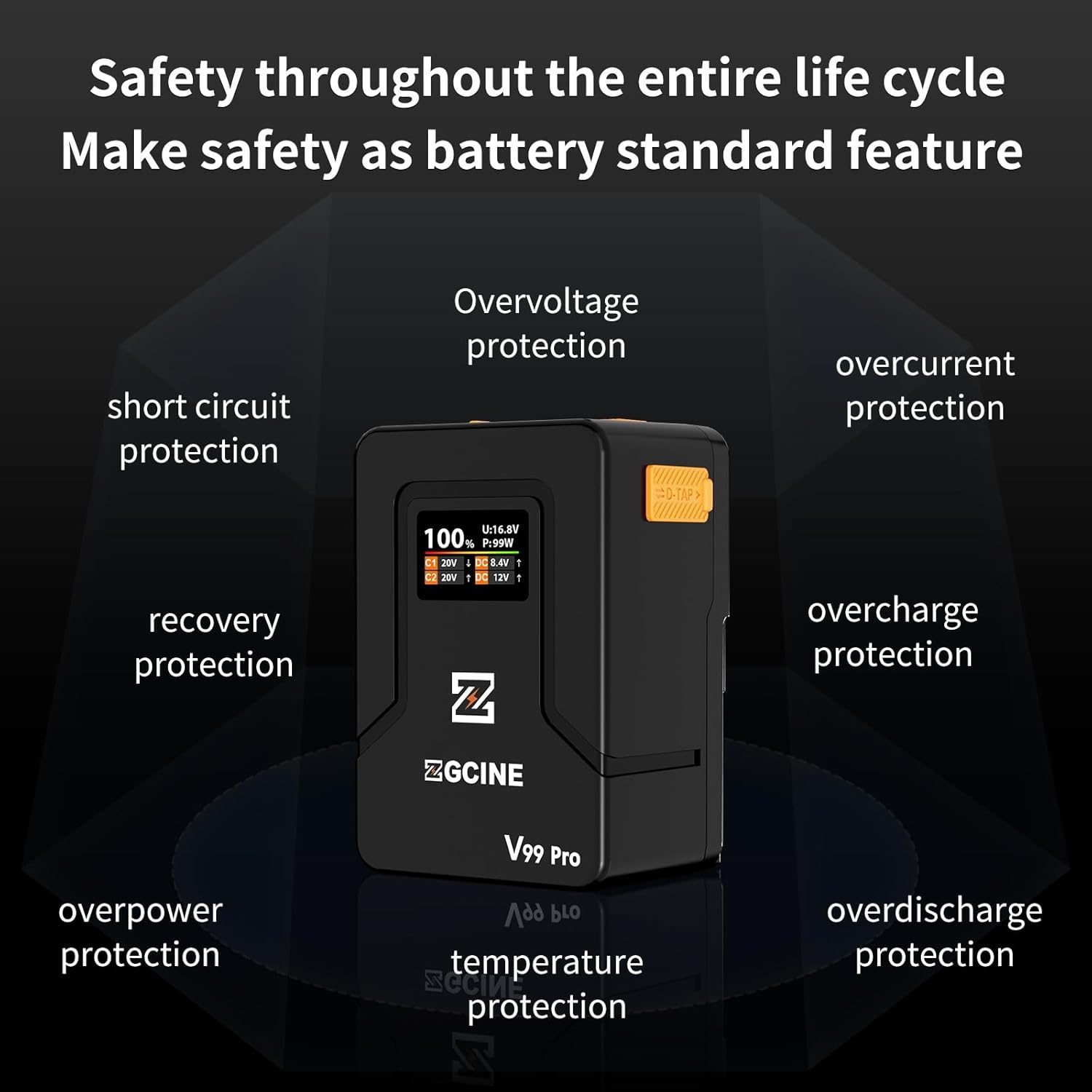 Engineered for durability, the ZG-V99Pro boasts a military-grade aluminum shell, impact-resistant internals, and advanced safety protocols to prevent overheating, over-discharge, and short circuits. At 99Wh, it complies with global airline regulations, making it the ultimate travel companion for international shoots.