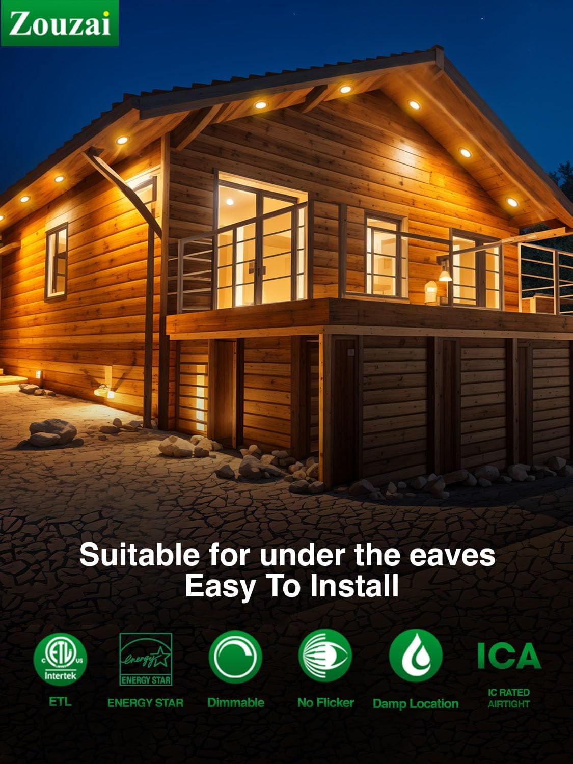 zouzai light has a lifespan of up to 50,000 hours, offering durability and energy efficiency. It is certified by ETL, Energy Star, FCC, and equipped with UL-approved quick-connect terminals for safe wiring. The fixture is IC-rated, making it safe for direct contact with insulation. With a damp-rated design, it is suitable for indoor use and covered outdoor areas (such as under eaves), but not for direct water exposure. The housing is made of corrosion-resistant aluminum, ensuring long-lasting strength and reliability.